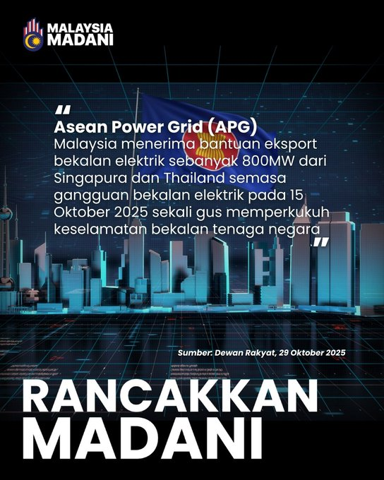 “Inisiatif Grid Kuasa ASEAN (APG) telah membuktikan kepentingannya dalam memperkukuh keselamatan bekalan tenaga negara. Semasa gangguan bekalan elektrik pada 15 Oktober 2025, Malaysia menerima bantuan eksport bekalan elektrik sebanyak 800MW dari Singapura (500MW) dan Thailand (300MW),” the ministry stated.