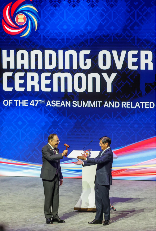 Malaysian Prime Minister Anwar Ibrahim hands over the ASEAN Chairmanship gavel to Philippine President Ferdinand Marcos Jr. during the Handing Over Ceremony at the conclusion of the 47th ASEAN Summit in Kuala Lumpur. .(Photo: Bernama)