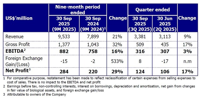SINGAPORE, Nov. 13, 2025 /PRNewswire/ — Golden Agri-Resources Ltd (“GAR” or the “Company”) continued its run of record-high revenue for a second consecutive quarter, recording US$9.53 billion for the nine-month period of 2025. Higher plantation output helped the Company capitalise on a 17% rise in crude palm oil (“CPO”) prices (FOB Belawan), while a modest increase in downstream volume further supported revenue growth.