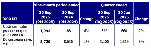 Fruit yield for the nine months of 2025 rose by 6% year on year from 12.8 to 13.6 tonnes per hectare supported by favourable weather conditions. This translated into a total fruit output of 6.7 million tonnes, with a corresponding increase in palm product output of 6% to almost 2.0 million tonnes.