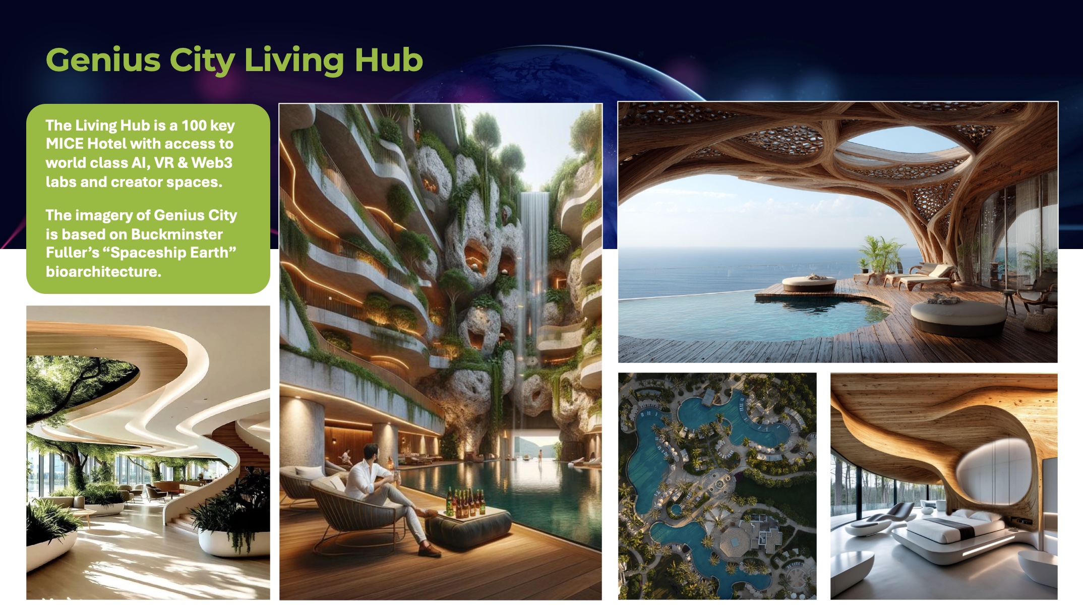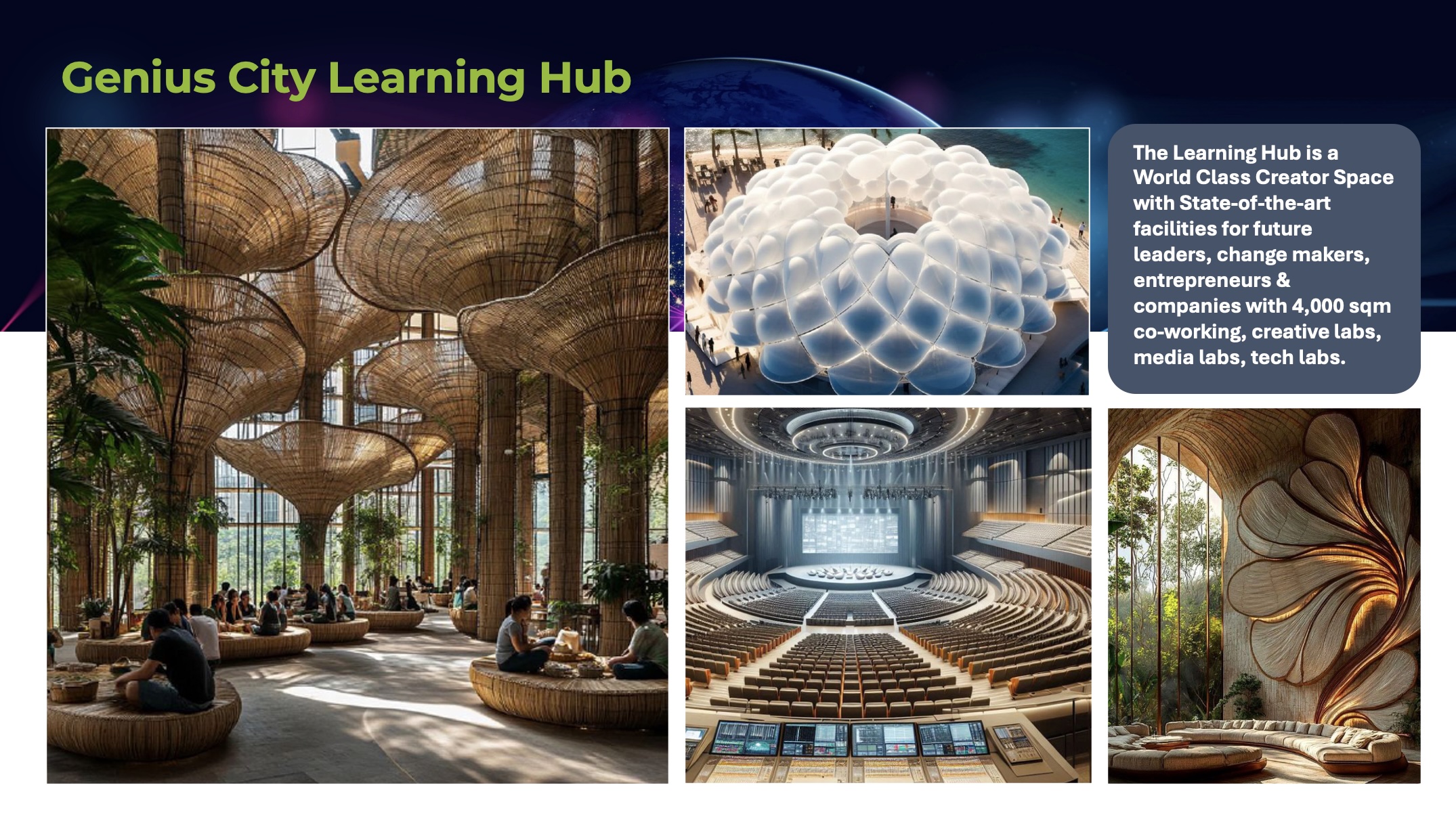 The Genius City Living Hub is a 100 key MICE Hotel with access to world class AI, VR and Web3 labs and creator spaces, with imagery inspired by Buckminster Fuller’s “Spaceship Earth” bio-architecture. It connects with the Learning Hub and Student Hub to provide a future-focused destination for companies and leaders seeking a state-of-the-art environment for their corporate retreats, conferences and training.