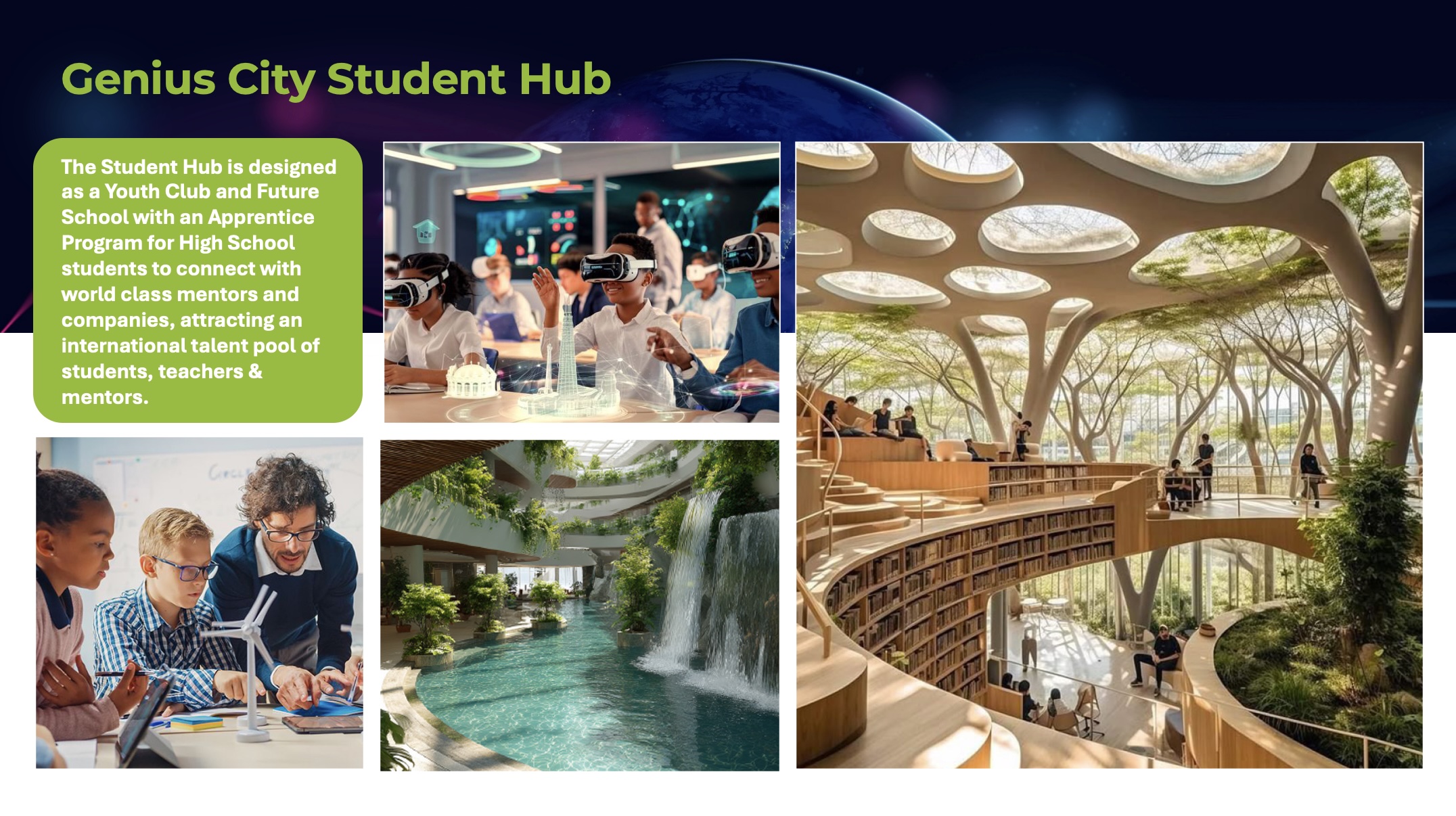 The Genius City Student Hub is designed as a Youth Club and Future School, connecting students with world class mentors and companies, attracting an international talent pool of students, teachers and mentors.