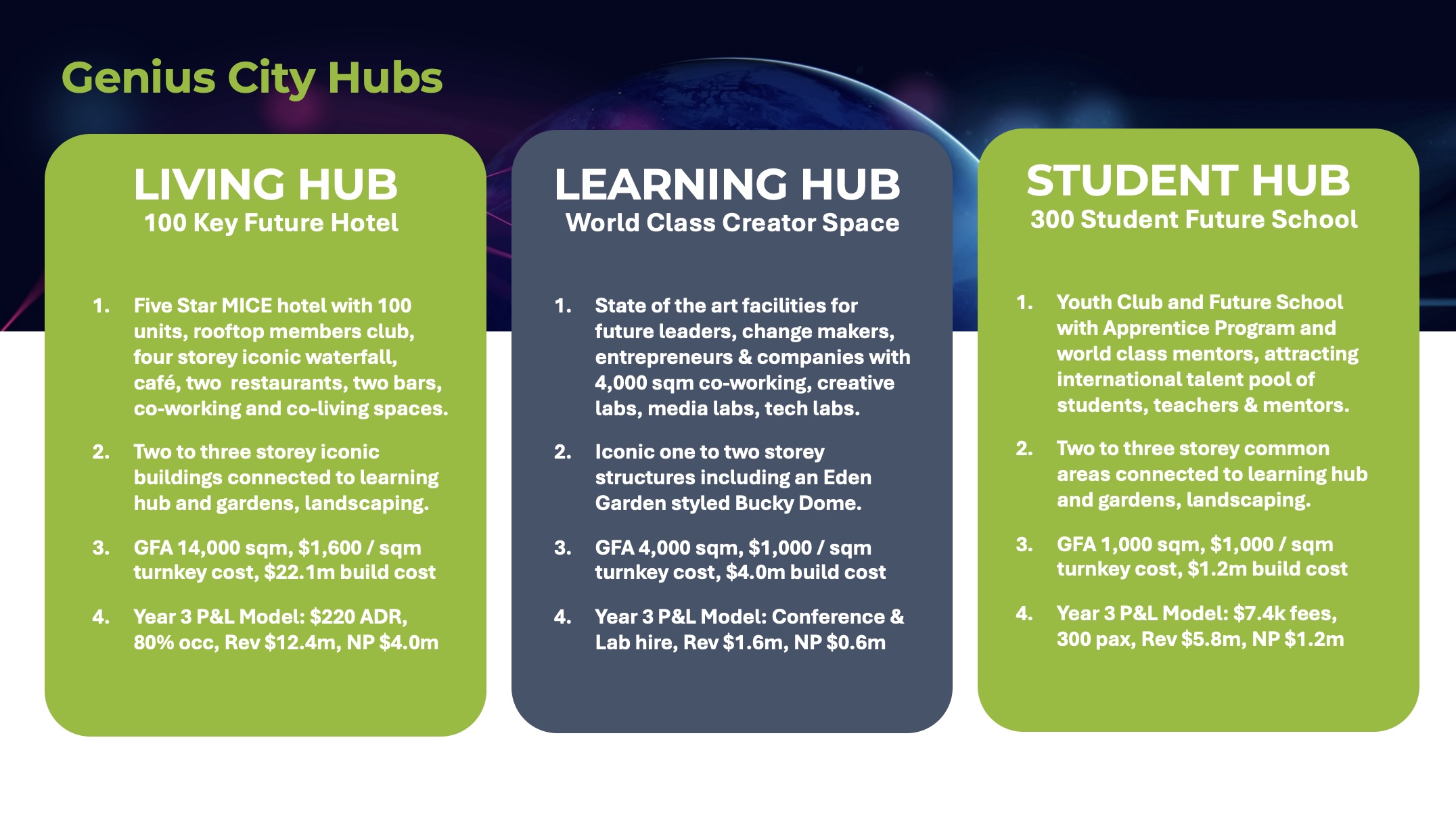 The Learning Hub has a robust revenue model by sharing co-working, creative labs, media labs, tech labs and workshop facilities between the Living Hub hotel model and Student hub high school model. Our Genius apprentice and accelerator programs also enable a lifelong learning model to ensure the next generation is being trained on the relevant future skills most needed as AI, robotics and exponential technologies continue to disrupt the current world of work.