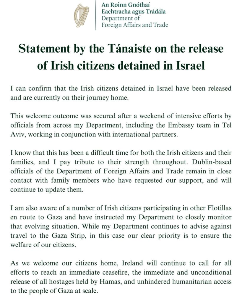 DUBLIN, Oct 6, 2025 – The Irish government has confirmed the release of several Irish citizens who were detained by Israeli authorities, with the individuals now en route home following a weekend of intense diplomatic negotiations.