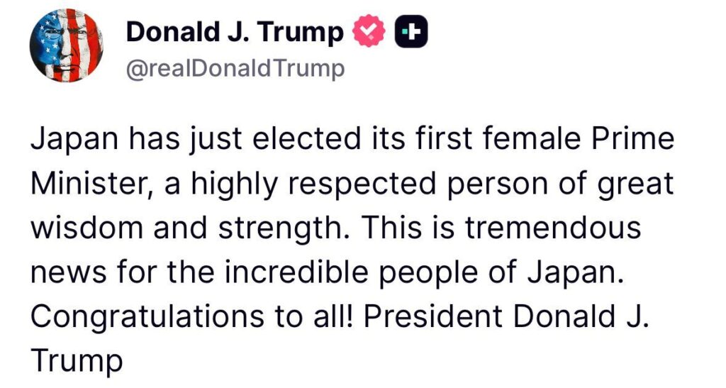 “I was very pleased to receive such warm words of congratulations from @realDonaldTrump,” Takaichi wrote in English, adding in Japanese that she looks forward to collaborating with the president “to make our 🇯🇵🇺🇸 Alliance even stronger & more prosperous, and to advance a Free and Open Indo-Pacific.”