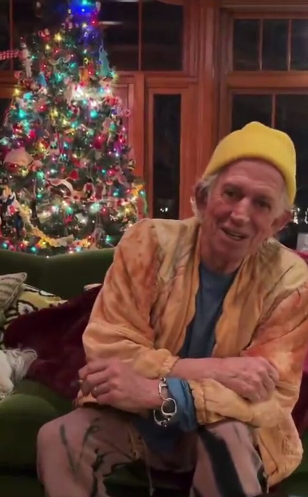 In the 16-second video, Richards sits comfortably on a green couch in front of a lavishly decorated Christmas tree twinkling with colorful lights and ornaments. Dressed in a casual tie-dye jacket, blue shirt, and a bright yellow beanie, he gestures animatedly while delivering his message. A lighter and what appears to be a book or magazine rest on the table in front of him, adding to the laid-back, authentic vibe that fans have come to associate with the Stones’ co-founder.