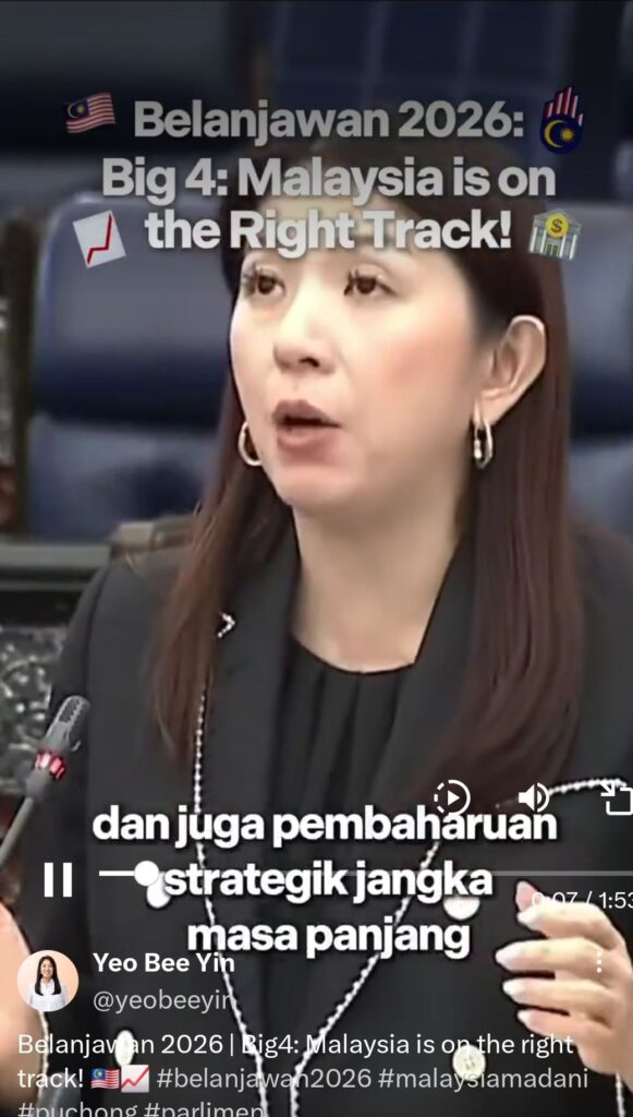 “Belanjawan 2026: Big 4 – Malaysia is on the Right Track!” Yeo declared in a nearly two-minute video clip shared on her X (formerly Twitter) account, which has garnered over 600 views and dozens of likes within hours. The footage, captured from the Dewan Rakyat chamber, shows Yeo at the podium, flanked by national flags and economic charts, as she flips through a binder of reports.