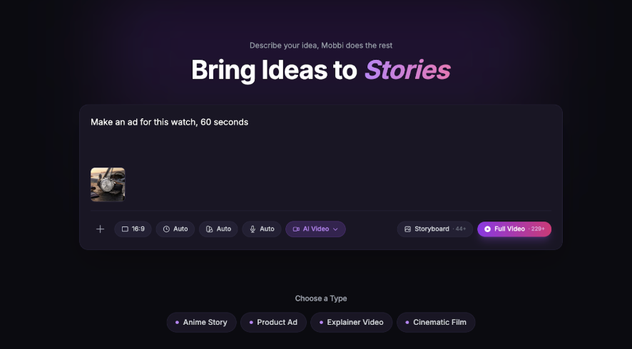 Unlike most AI video generator that produce only 5–10 second clips, Mobbi supports videos of any length, including ads, films, anime, explainer videos, and product walkthroughs.