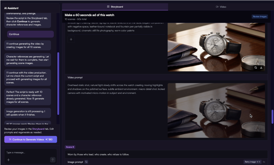 3. Review the scene images and customize prompts to regenerate if needed. Then generate videos for each scene.