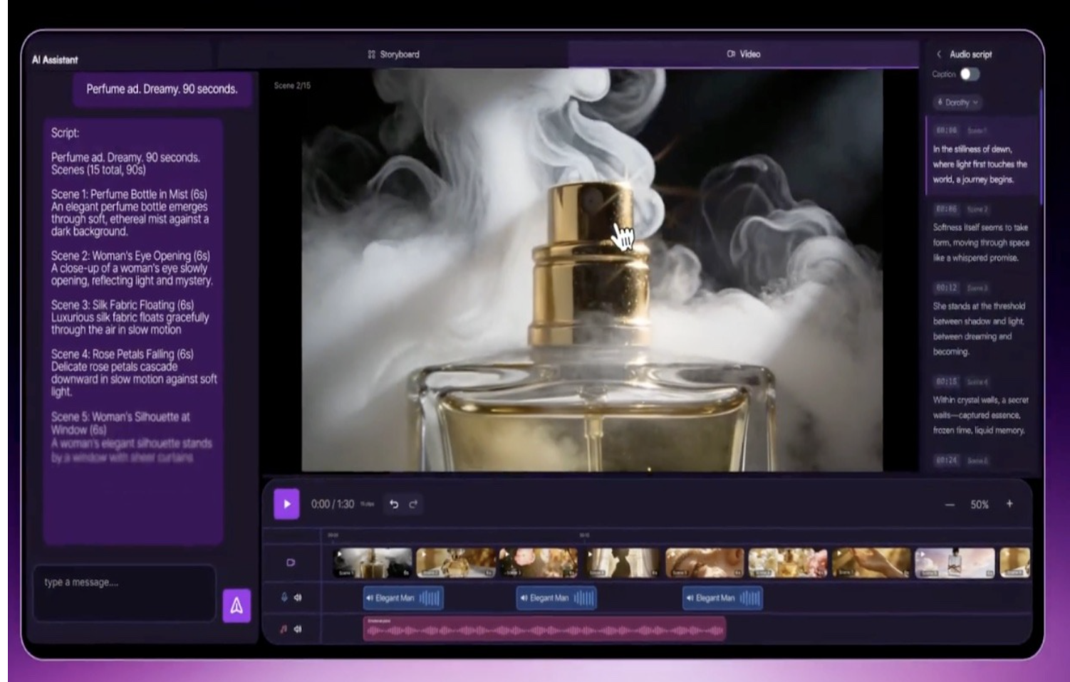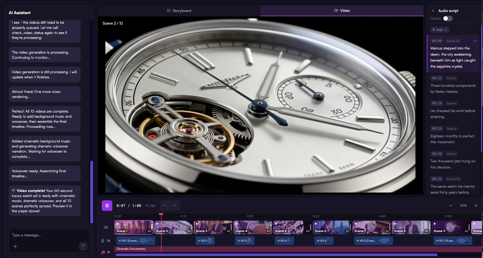 5. Chat with the agent to make any edits: modify a specific scene, change the voiceover, swap the music, and more. Export the final video when you’re ready.