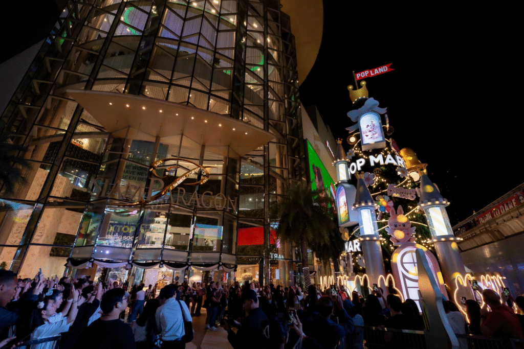 - POP LAND CASCADE – A dreamlike tunnel decked with beloved POP MART IPs, connecting Siam Paragon’s G floor to Parc Paragon, creating a whimsical journey through fantasy.