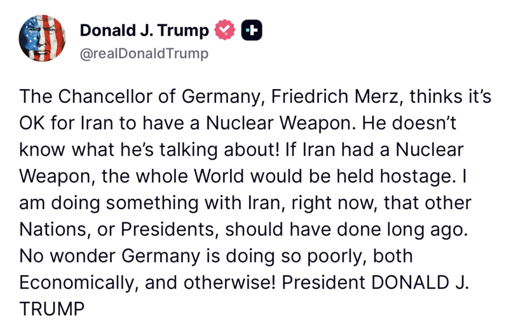 In a post shared by the White House Rapid Response account (@RapidResponse47), Trump stated: “The Chancellor of Germany, Friedrich Merz, thinks it’s OK for Iran to have a Nuclear Weapon. He doesn’t know what he’s talking about! If Iran had a Nuclear Weapon, the whole World would be held hostage. I am doing something with Iran, right now, that other Nations, or Presidents, should have done long ago. No wonder Germany is doing so poorly, both Economically, and otherwise!”