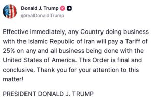 WASHINGTON D.C January 12, 2026 – U.S. President Donald J. Trump announced on Monday that the United States will impose a 25% tariff on any country conducting business with the Islamic Republic of Iran, effective immediately. The move aims to increase economic pressure on Tehran amid a violent crackdown on widespread anti-government protests.