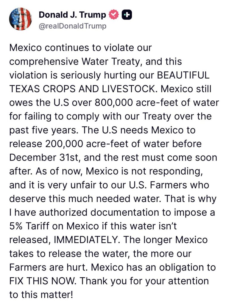 Trump concluded his message with a direct call to action: “That is why I have authorized documentation to impose a 5% Tariff on Mexico if this water isn’t released, IMMEDIATELY. The longer Mexico takes to release the water, the more our Farmers are hurt. Mexico has an obligation to FIX THIS NOW. Thank you for your attention to this matter!”