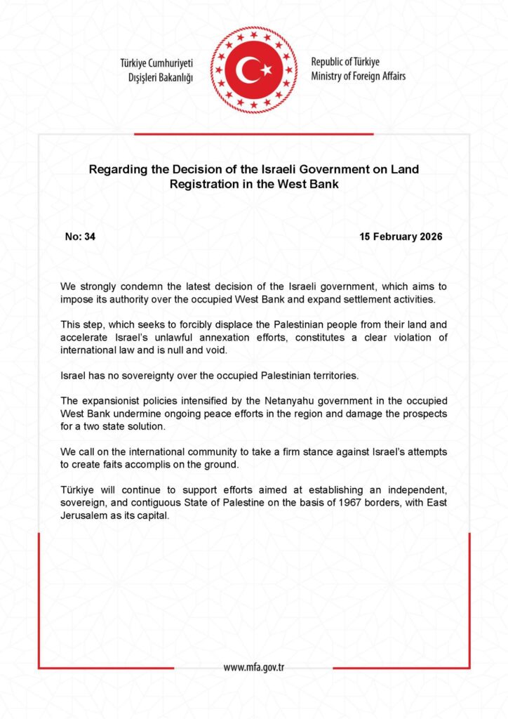 ANKARA February 15, 2026 – The Ministry of Foreign Affairs of the Republic of Türkiye has issued a strong condemnation of a recent decision by the Israeli government concerning land registration procedures in the occupied West Bank.