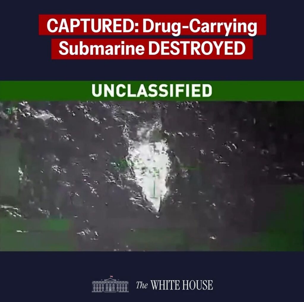 WASHINGTON, D.C. Oct 18, 2025 — In a decisive escalation of America’s war on drug trafficking, U.S. military forces have obliterated a suspected submarine laden with narcotics en route to American shores, President Donald Trump announced Saturday. The strike, captured in declassified footage released by the White House, marks a stark message to international cartels: no vessel, no matter how sophisticated, will evade interception.