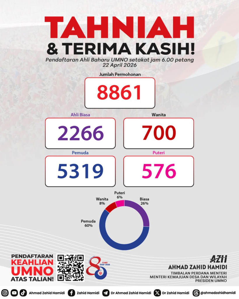 KUALA LUMPUR, April 22, 2026 – The United Malays National Organisation (UMNO) has recorded a strong surge in interest, with 8,861 applications for new membership received through its online registration portal in only three days.
