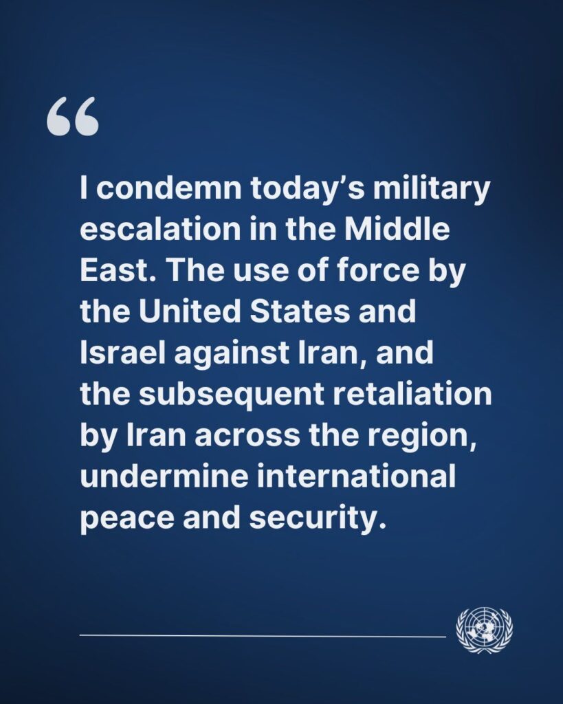 “I condemn today’s military escalation in the Middle East. The use of force by the United States & Israel against Iran, and the subsequent retaliation by Iran across the region, undermine international peace & security.”