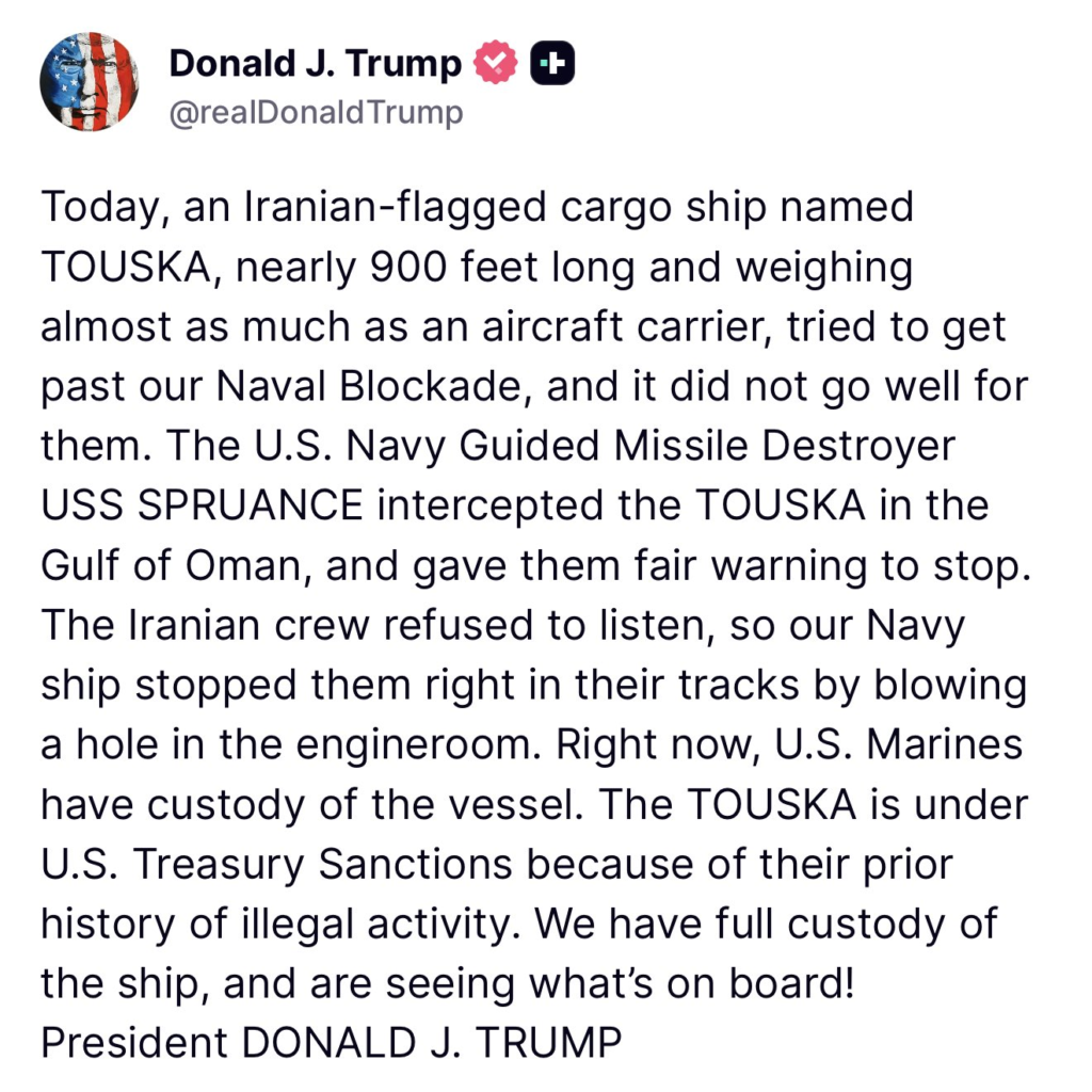 According to the President’s statement, the ship—identified as the TOUSKA, an Iranian-flagged cargo vessel nearly 900 feet long and weighing almost as much as an aircraft carrier—tried to run the blockade. The U.S. Navy Guided Missile Destroyer USS SPRUANCE intercepted the vessel and issued a fair warning to stop.