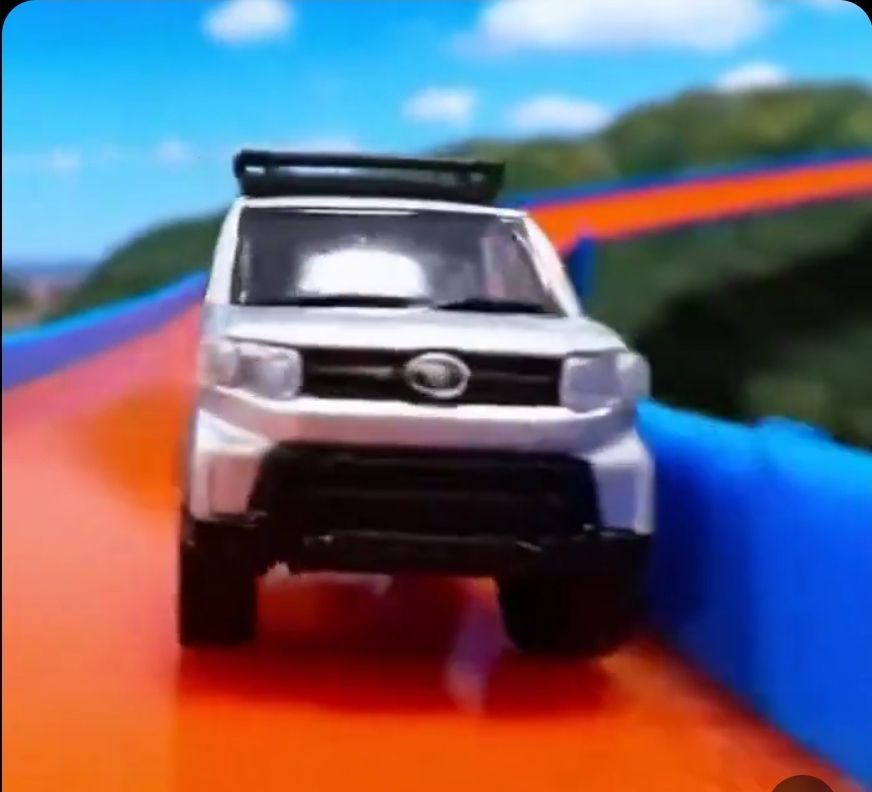 The post features a high-energy, toy-like animation of a miniature silver Volkswagen SUV—reminiscent of a Hot Wheels vehicle—barreling down a vibrant orange race track suspended over lush, tropical green hills under a bright blue sky. The clip, lasting about 13 seconds, captures the pint-sized rig navigating sharp curves and ramps with exaggerated flair, symbolizing speed, innovation, and unapologetic American ingenuity. “President Donald J. Trump has approved TINY CARS to be built IN AMERICA! 🇺🇸,” the caption reads, emphasizing national pride with emphatic capitalization and a patriotic emoji.