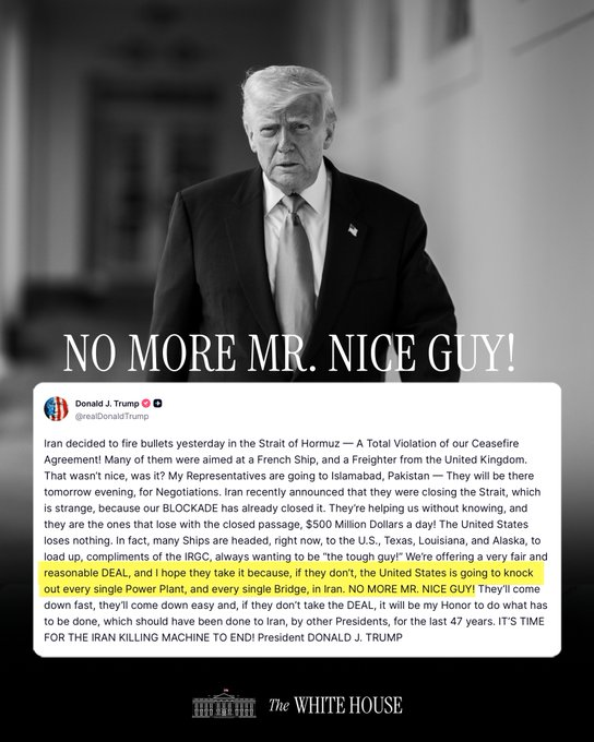 “My Representatives are going to Islamabad, Pakistan — They will be there tomorrow evening, for Negotiations… We’re offering a very fair and reasonable DEAL, and I hope they take it because, if they don’t, the United States is going to knock out every single Power Plant, and every single Bridge, in Iran. NO MORE MR. NICE GUY!”