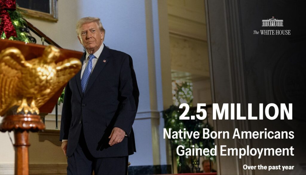 WASHINGTON, D.C. January 2, 2026 – The Trump administration highlighted what it described as a significant shift in the U.S. job market, claiming that 2.5 million native-born Americans gained employment over the past year while 670,000 foreign-born workers lost jobs. The assertion, posted on the official White House X account on January 2, came with a graphic featuring President Donald Trump and data attributed to the Bureau of Labor Statistics (BLS).
