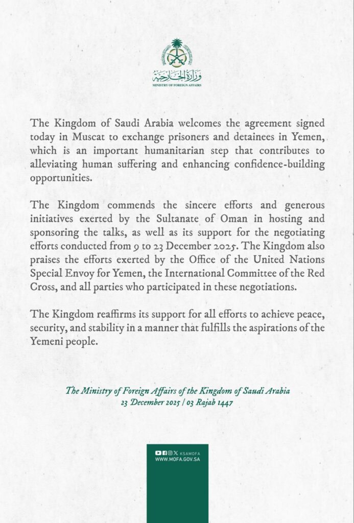 The Kingdom of Saudi Arabia welcomed the agreement in a statement from its Ministry of Foreign Affairs, calling it “an important humanitarian step that contributes to alleviating human suffering and enhancing confidence-building opportunities.” Riyadh praised Oman’s “sincere efforts and generous initiatives” in hosting the talks from December 9 to 23, as well as the contributions of the UN envoy’s office and the ICRC.